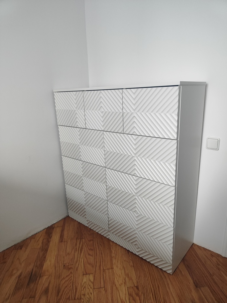 Собрали комод, который сами для себя придумали на основе имеющихся образцов с 9-ю выдвижными ящиками. Фасады с фрезеровкой выполнены и подогнаны очень хорошо. Рисунок был сложный, но все совпало и получилось очень красиво. Отдельное спасибо за нижнюю планку фасада на цоколь- получился единый рисунок и современный внешний вид. Есть замечания по глубине ящиков, т.к. в собранном виде ящики не доходят до задней стенке на 6 см. Как-то этот момент не согласовали. Думаю, сто можно было на 5 см точно увеличить глубину ящиков, что было бы функциональнее, т.к. комод это не только фасад, но и шкаф для вещей, постельного белья и Эти 5см я учитывала при выборе размера комода. Если проблема в фурнитуре, то можно было это обсудить. А так, нам теперь с этим жить. Ещё сборка тоже в некоторых местах не продумана ( центральные внутренние отверстия под симметричные направляющие почему-то одно сквозное. Получается, что направляющие с одной стороны прикрутили, а потом с другой стороны центральной стойки в те же отверстия нужно прикручивать с другой стороны направляющие. Шурупы ломаются друг о друга и конструкция кривая. Пришлось подгонять самим. Не хватило 2-х больших шурупов для сборки корпуса. Думаю, что лучше больше класть, чем меньше. Это уже 2-й наш большой заказ. В любом случае большое спасибо, что Вы воплощает наши мечты! Отдельное огромное спасибо инженеру-конструктору и мастеру по внешнему виду фрезеровки. Получилось ОГОНЬ!