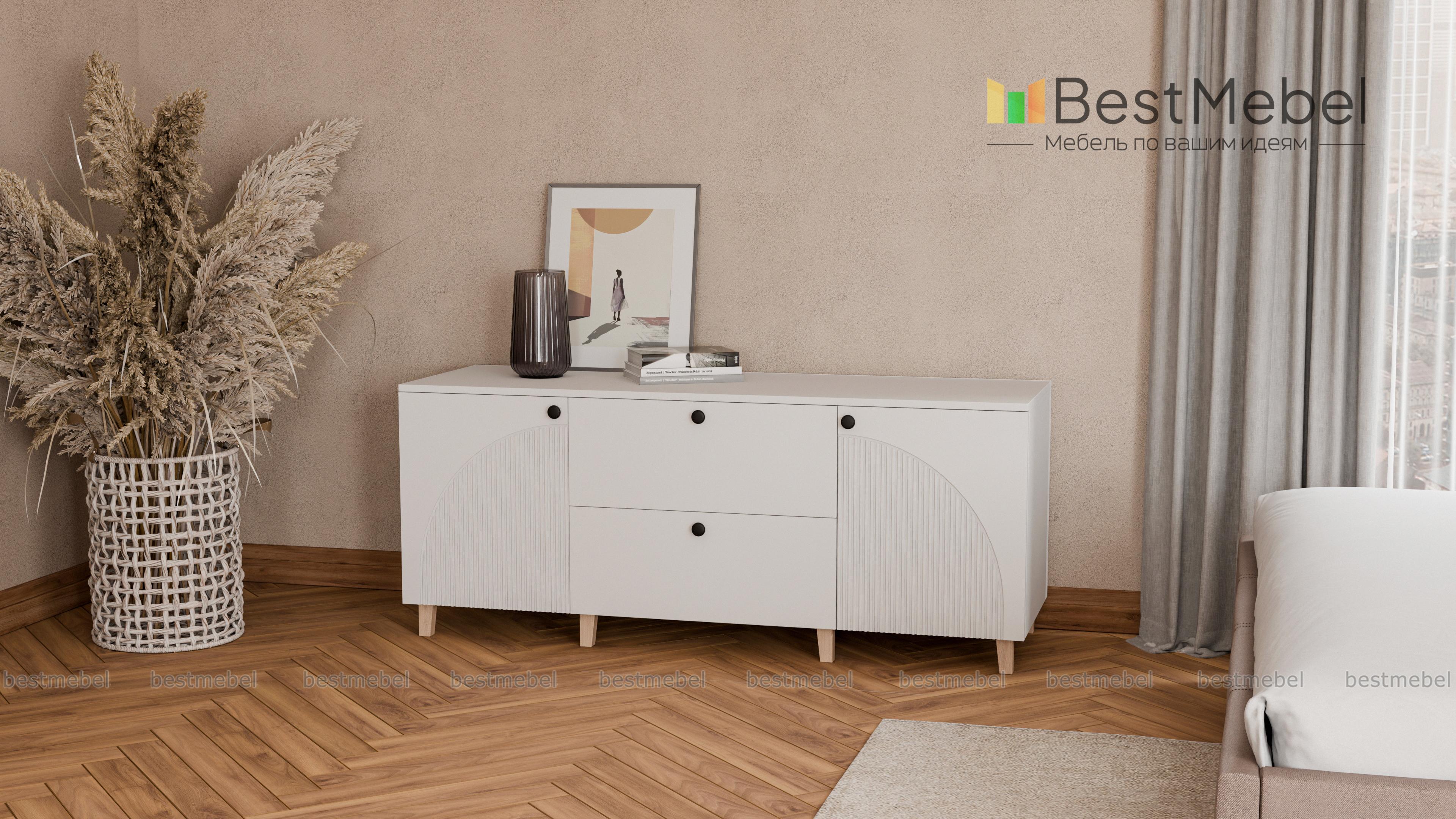 Комод Вивьен 4 BMS с высокими деревянными ножками поможет вам организовать хранение вещей и украсит интерьер. Широкий современный комод оборудован парой распашных секций с полками и двумя вместительными ящиками в центральной части. Прочный корпус изготовлен из ламинированной плиты, которая выдерживает большие нагрузки, а для фасада использован МДФ со стильным рельефом. Купить комод Вивьен 4 BMS приглашаем в наш интернет-магазин, по желанию изменив цвет и размеры.