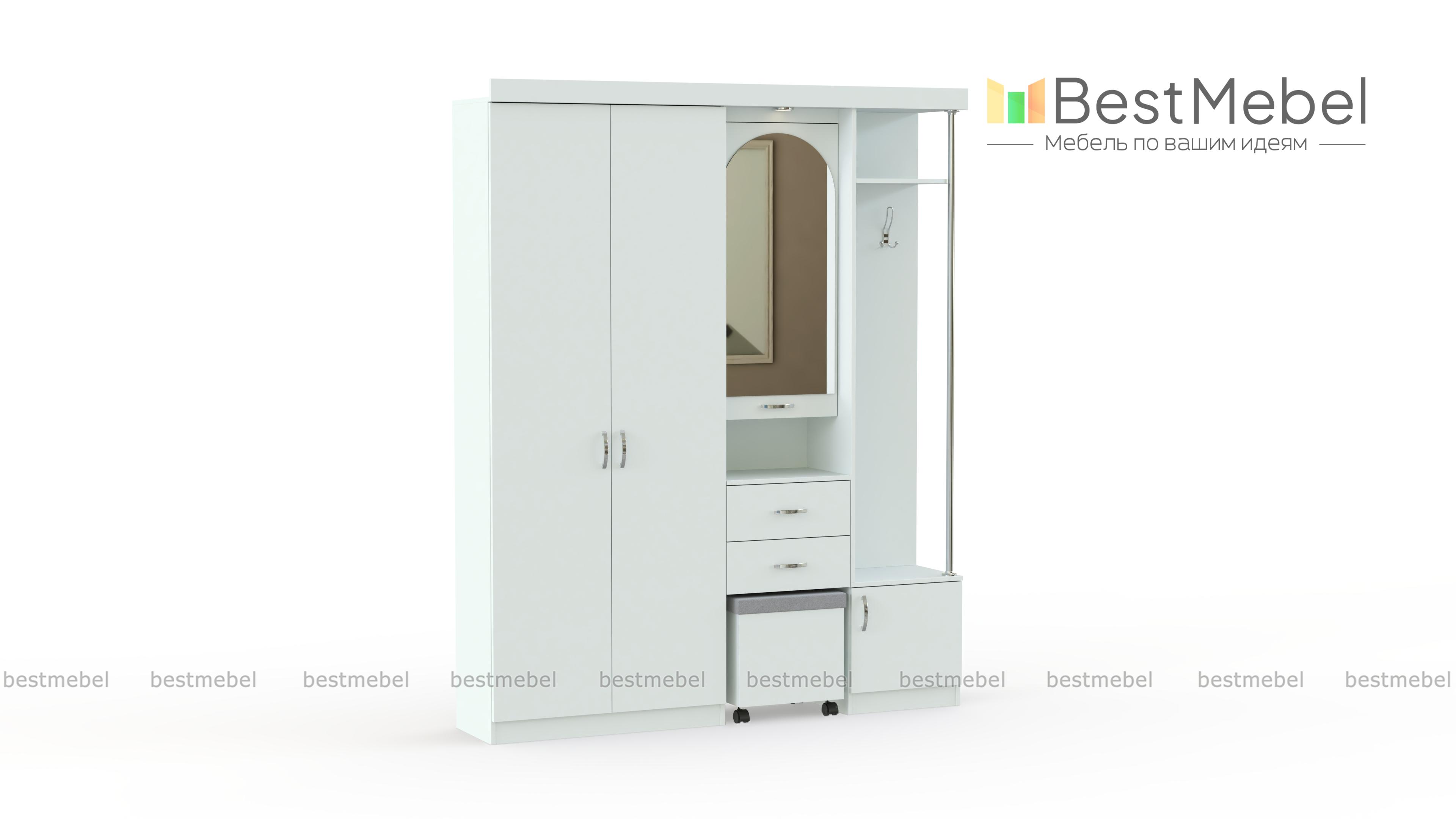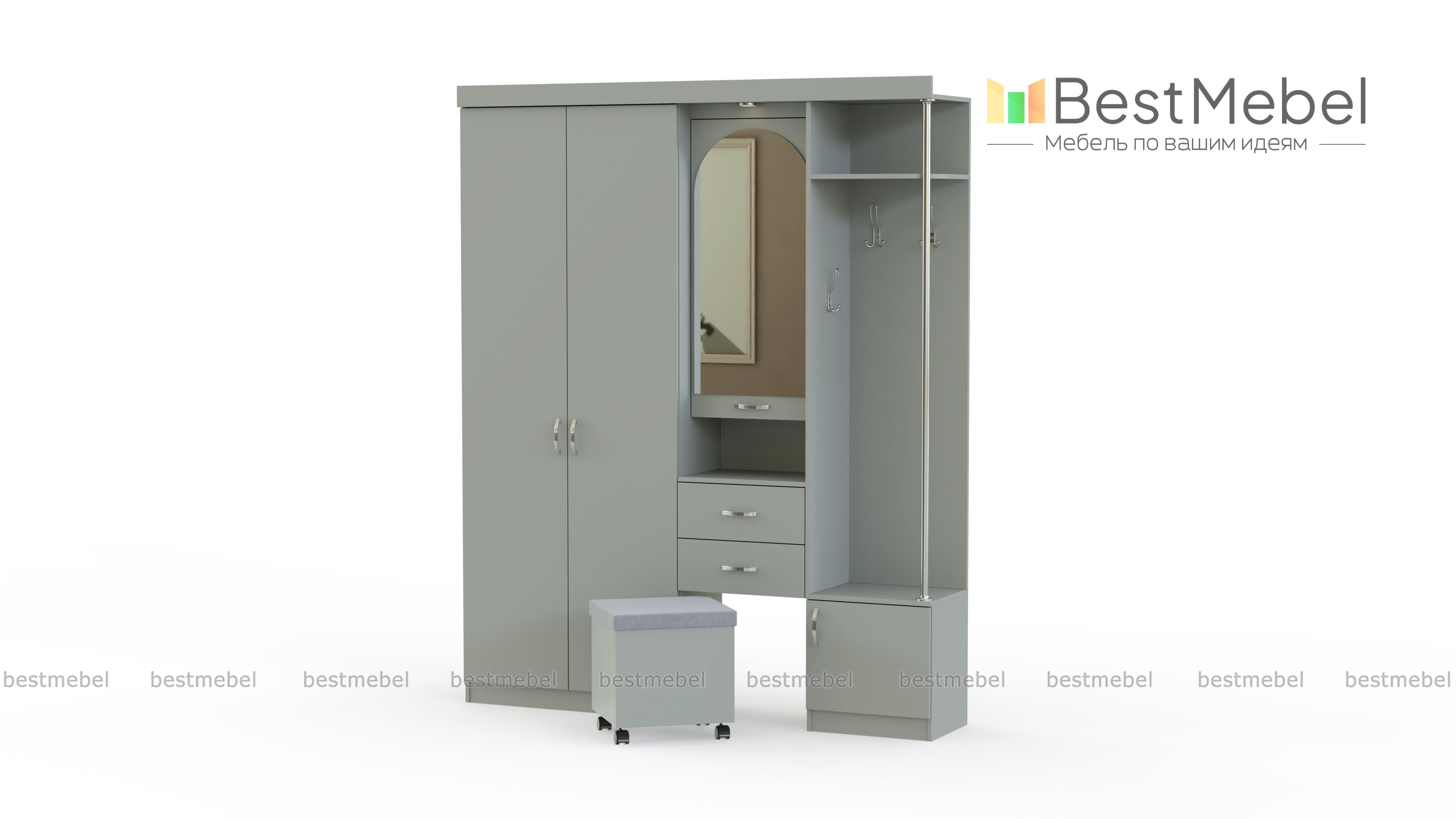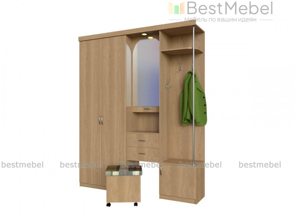 Прихожая Елена 1.7 ‒ практичное решение для практичных людей. Модель включает в себя распашной шкаф, открытое отделение с крючками, тумбу для обуви, ящики для мелких вещей, полку для сумок или корреспонденции. В прихожей предусмотрена очень удобная подсветка над зеркалом, что позволит контролировать порядок в своем гардеробе перед выходом на улицу. Также есть пуф на колесиках, помогающий с удобством обуваться. В открытом отделении находится полка для головных уборов. Купить это прекрасное изделие можно со скидкой на нашем сайте.