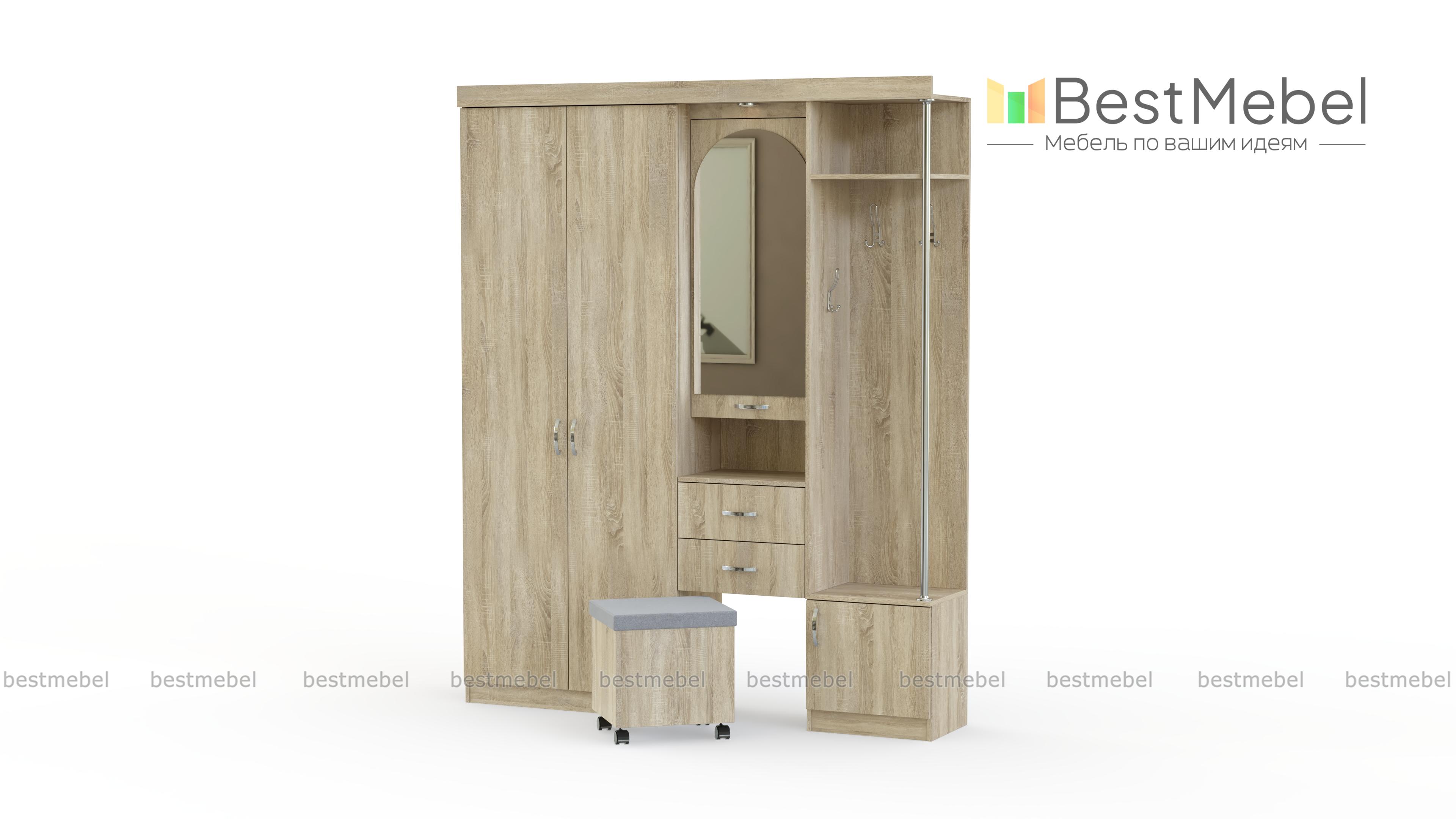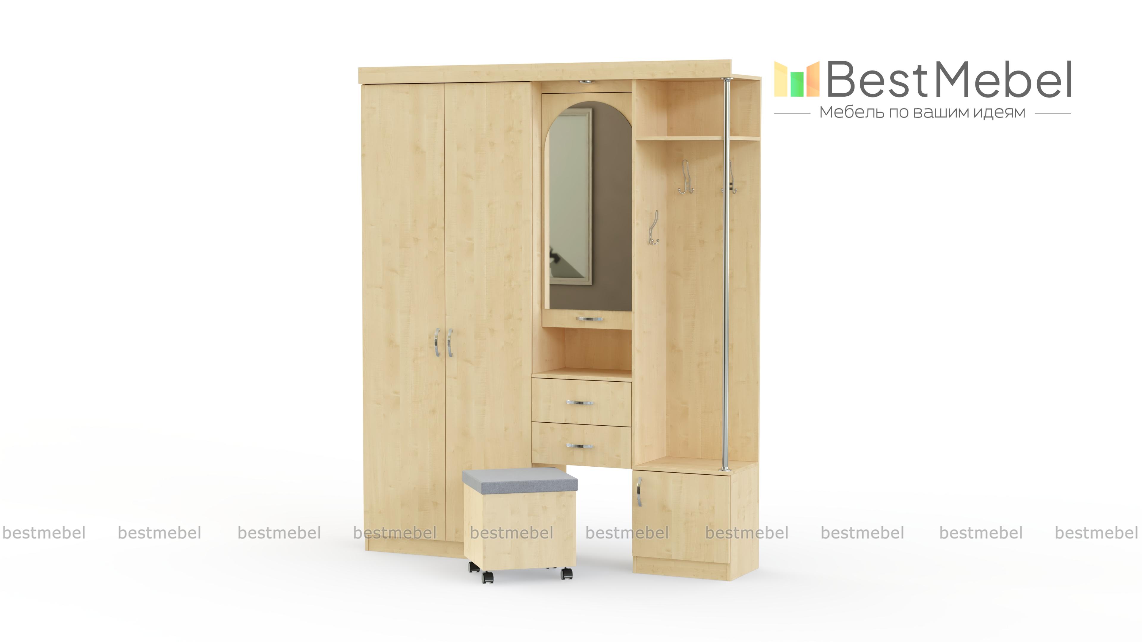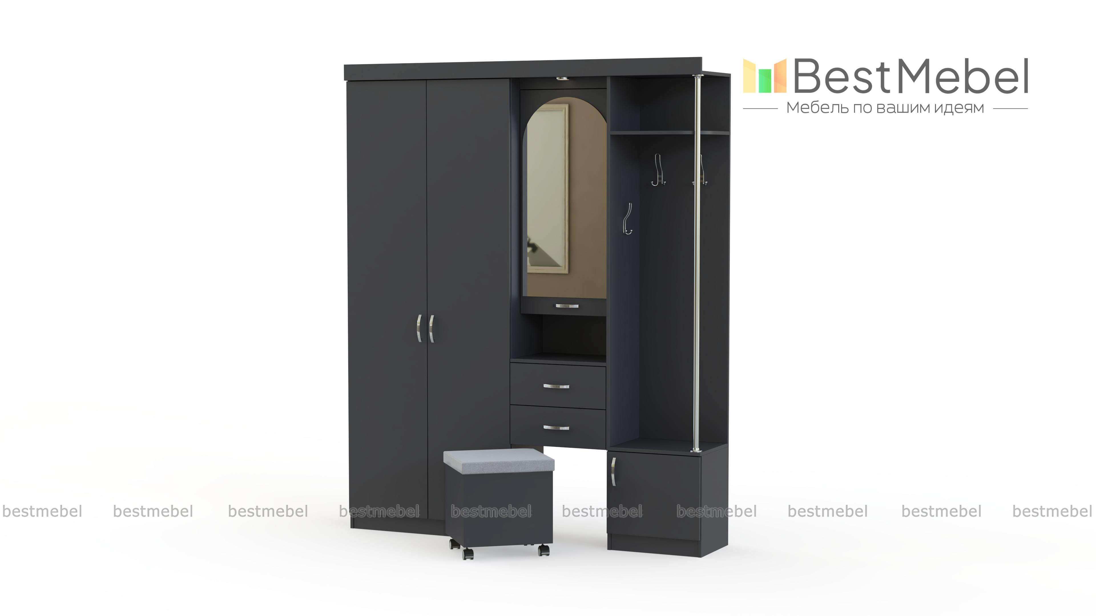 Прихожая Елена 1.7 ‒ практичное решение для практичных людей. Модель включает в себя распашной шкаф, открытое отделение с крючками, тумбу для обуви, ящики для мелких вещей, полку для сумок или корреспонденции. В прихожей предусмотрена очень удобная подсветка над зеркалом, что позволит контролировать порядок в своем гардеробе перед выходом на улицу. Также есть пуф на колесиках, помогающий с удобством обуваться. В открытом отделении находится полка для головных уборов. Купить это прекрасное изделие можно со скидкой на нашем сайте.