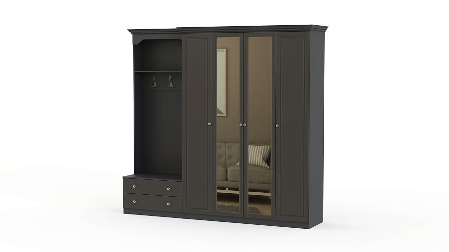 Прихожая Марьяна 4 BMS отличается крупными габаритами и станет прекрасным выбором для просторных помещений. Композиция в классическом стиле объединила четырехдверный распашной шкаф, оборудованный полками и штангой, и секцию с открытой вешалкой, обувницей и полкой под головные уборы. Рамочные фасады выполнены в темных тонах и оснащены ручками-кнопками, центральные створки – зеркальные, удобные для примерки и визуально расширяющие границы комнаты. Купить прихожую Марьяна 4 BMS