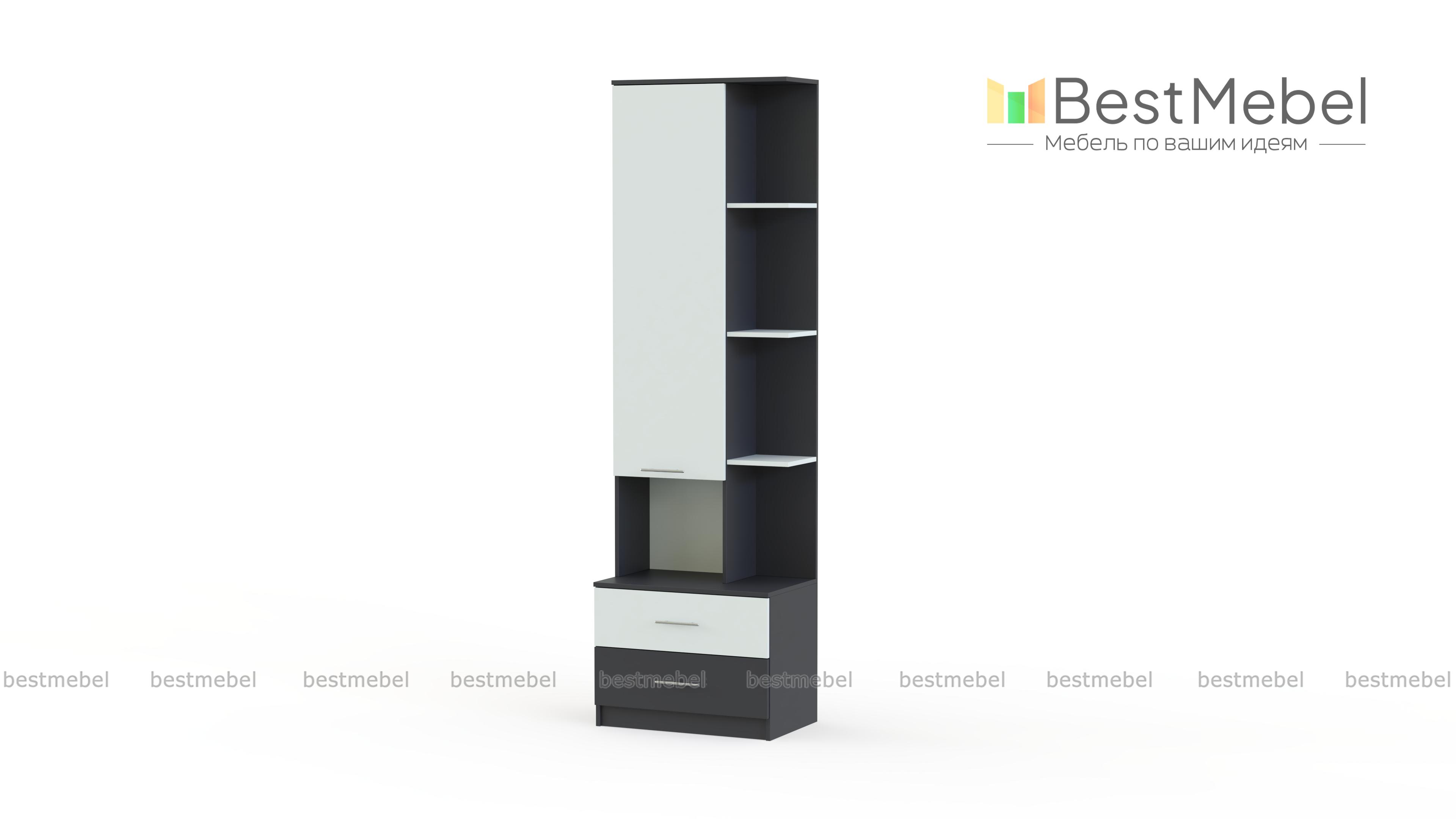 Пенал комбинированный правый Ральф – стильный современный шкафчик, выполненный в сочетании темного и светлого цветов. Изделие будет отлично смотреться в жилой комнате. Конструкция модели Ральф, помимо двух выдвижных ящичков и ниши с открывающейся дверцей, предусматривает угловые полочки, на которых можно разместить различные элементы декора и мелкие вещи. Небольшая столешница позволит положить на видное место ваши ключи, кошелек или поставить сумку. Купить пенал комбинированный правый Ральф Вы можете прямо сейчас.