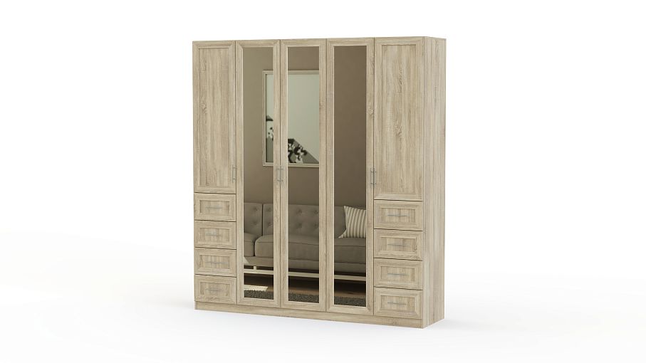 Распашной шкаф Крона 19 BMS станет незаменимым в интерьере просторной спальни или гардеробной благодаря редкой вместительности и трем зеркальным дверцам в центральной части. Крупногабаритная конструкция отличается надежностью и визуальной легкостью благодаря светлым рамочным фасадам древесных тонов. Внутреннее наполнение из двух платяных отделений, двух бельевых секций и выдвижных ящиков позволит бережно разместить предметы гардероба. Купить распашной шкаф Крона 19 BMS, подобрав необходимые параметры, вы сможете в нашем интернет-магазине.