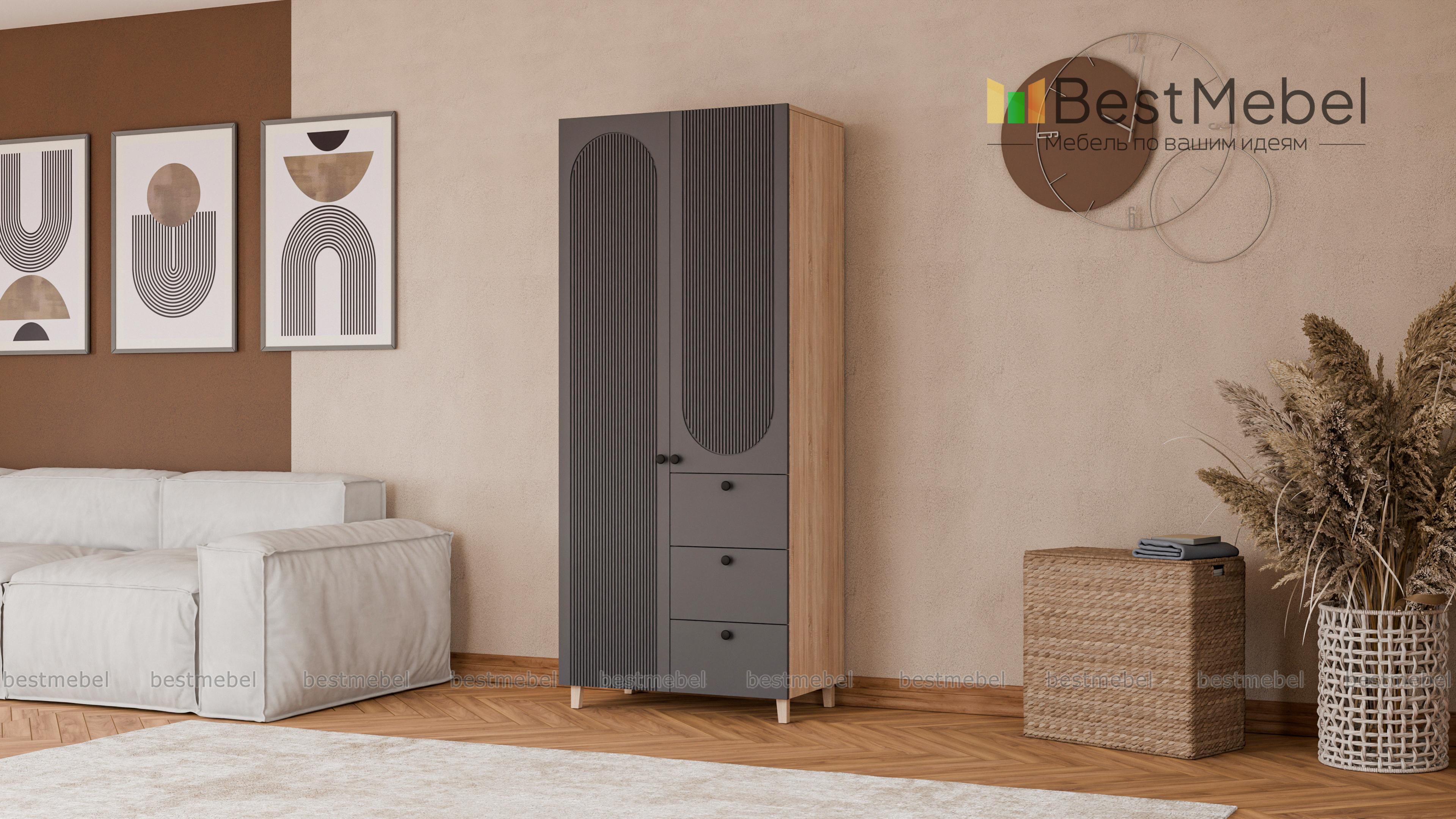 Шкаф распашной Рене 18 BMS — это небольшой гардероб, стильный и функциональный. Для хранения одежды предназначены распашные секции, а дополнение в виде трех выдвижных ящиков позволит разместить в порядке постельное белье и мелкий трикотаж. В отделке фасада шкафа использована оригинальная геометричная фрезеровка, высокие ножки добавят силуэту легкости. Купить шкаф распашной Рене 18 BMS вы всегда сможете в нашем интернет-магазине, самостоятельно подобрав цвета и размеры.