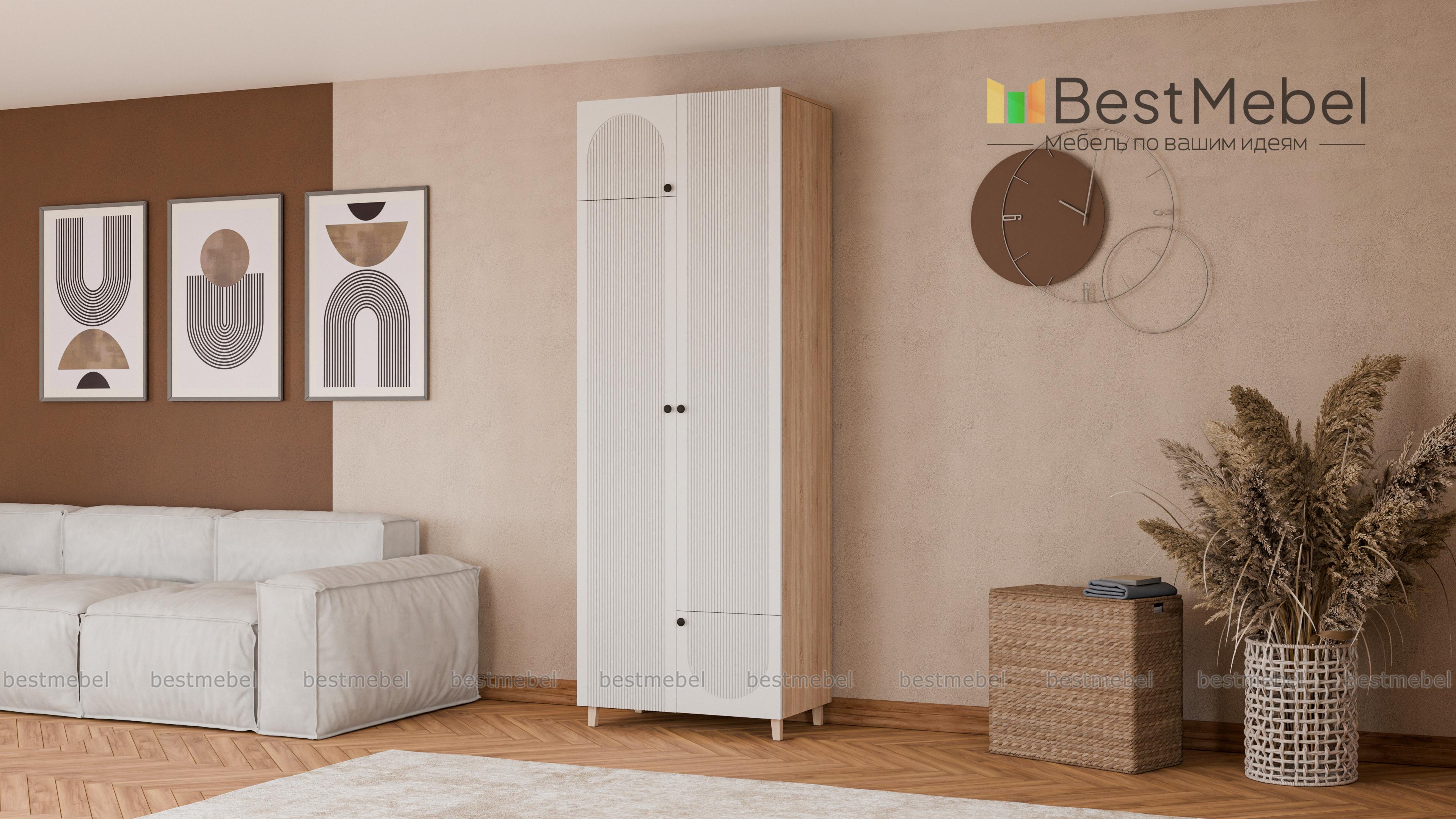 Шкаф распашной Рене 20 BMS компактен и прекрасно впишется в комнаты малого метража: спальни, детские и прихожие. Для более удобного хранения двухдверная модель оборудована дополнительными малыми распашными секциями — сверху и снизу. Прочный фасад из МДФ украшает акцентная фрезеровка, высокие ножки шкафа выполнены в оттенке светлого дерева Купить шкаф распашной Рене 20 BMS, изготовленный по индивидуальным размерам, приглашаем к нам в интернет-магазин.