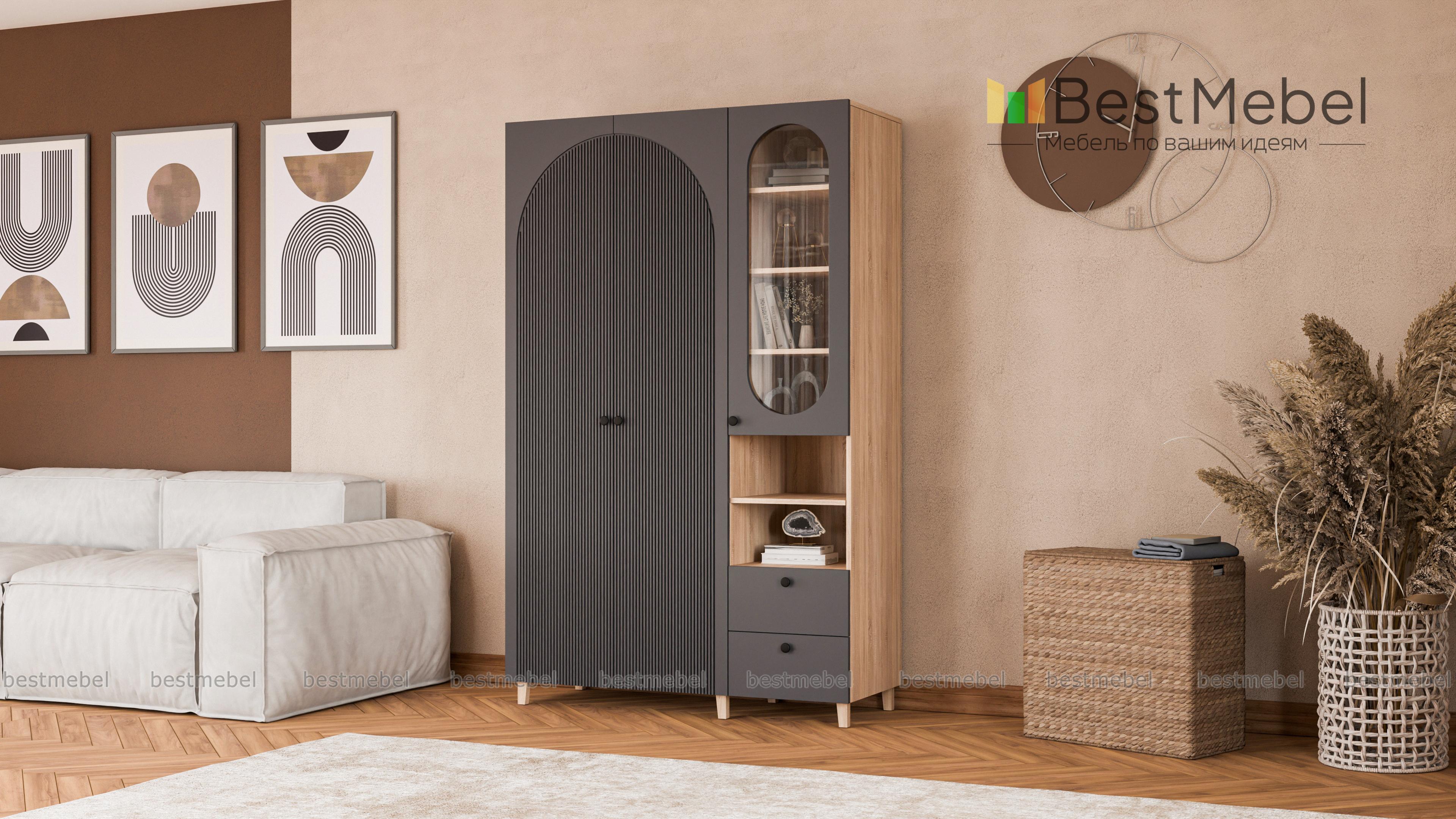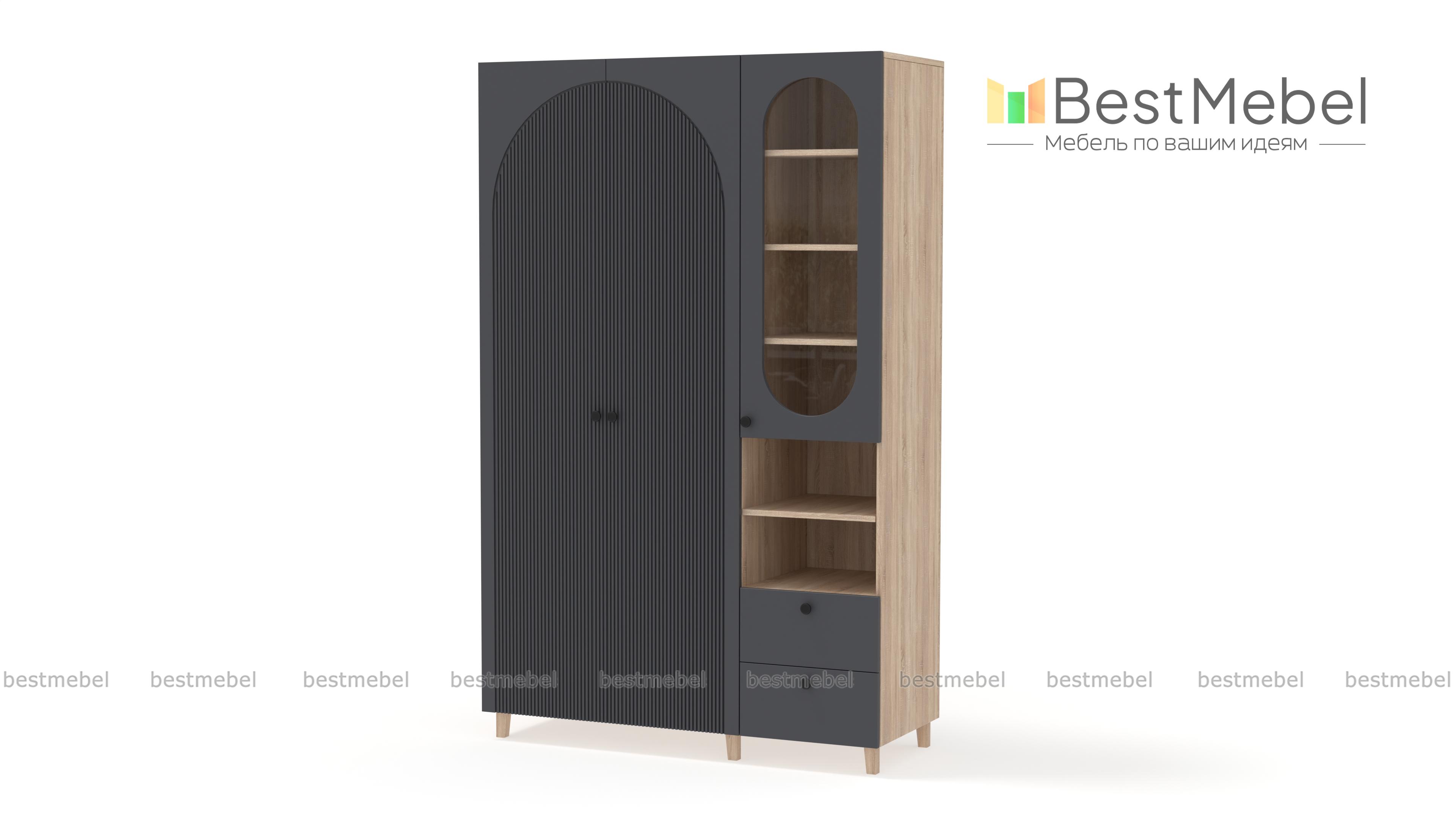 Шкаф распашной Вивьен 22 BMS на деревянных ножках — элегантный и функциональный. Грамотно организовать хранение помогут отделение со штангой, витрина, открытая секция с полкой и пара выдвижных ящиков. Универсальное цветовое решение шкафа сочетается практически с любой отделкой и декором, а полукруглые вырезы вносят в интерьер стильный акцент. Купить шкаф распашной Вивьен 22 BMS вы сможете в нашем интернет-магазине, по желанию изменив цвет и размеры.