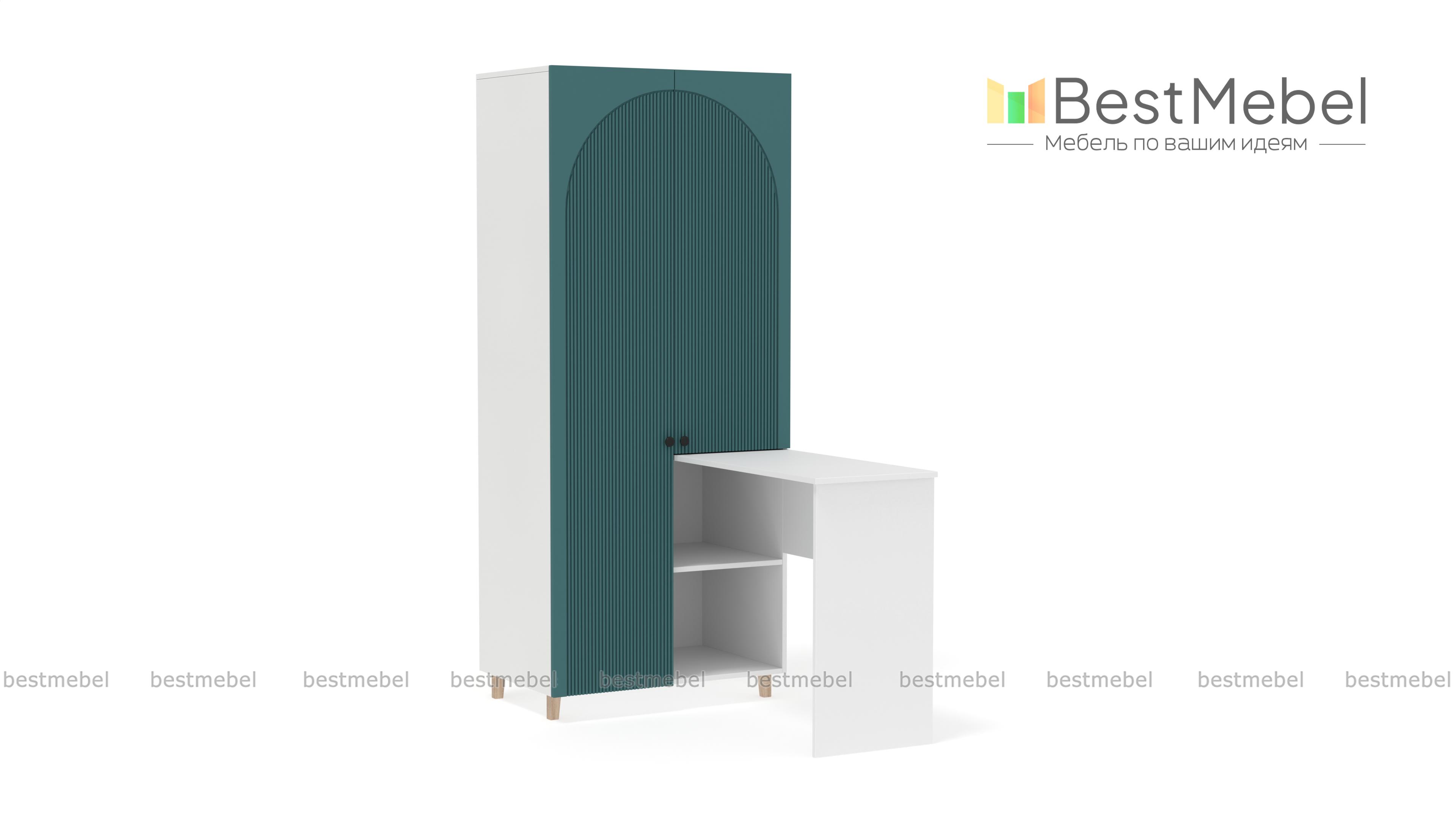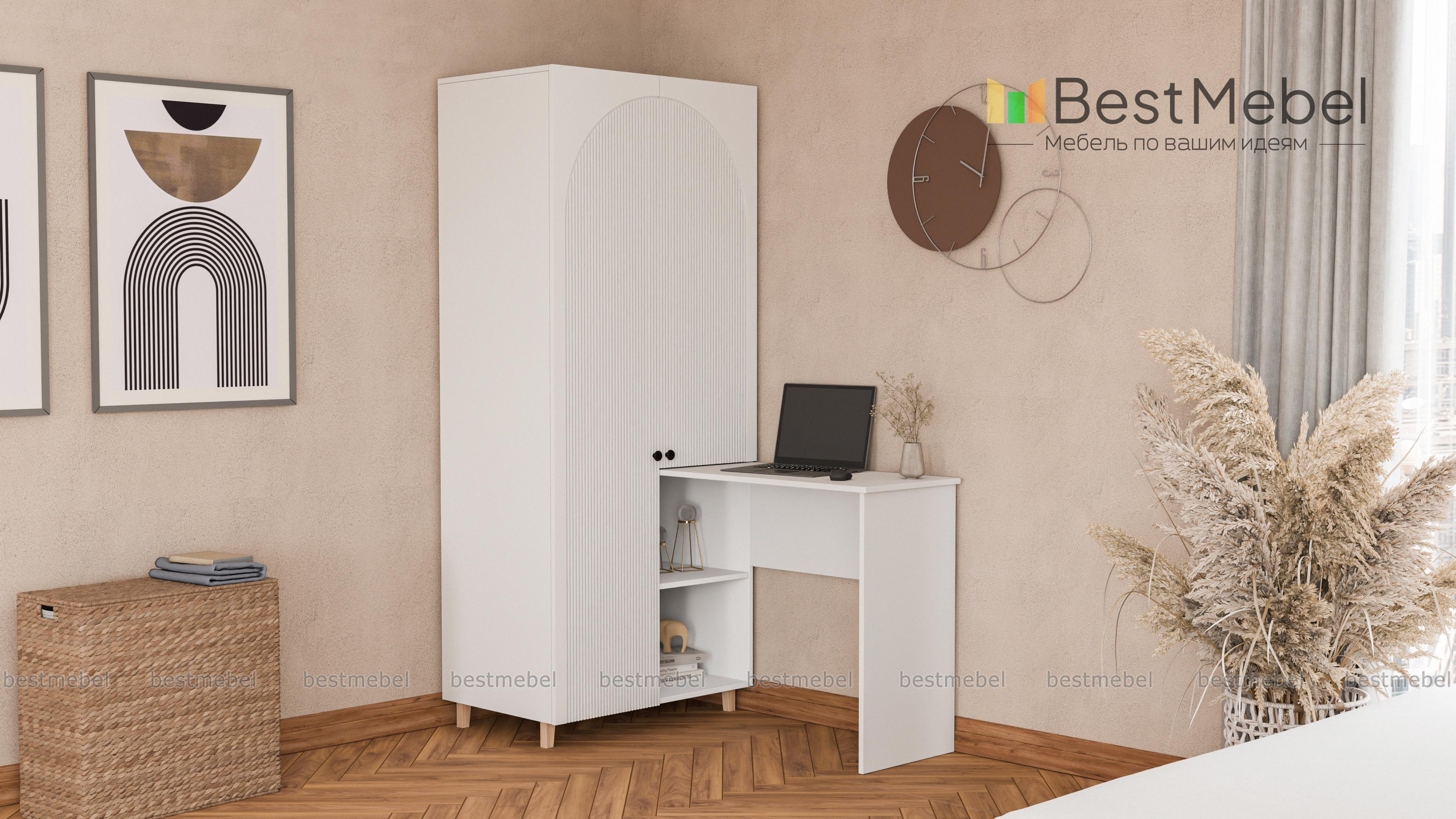 Шкаф со столом Вивьен 3 BMS — функциональная и стильная мебель в небольшую комнату. Угловая конструкция из распашного шкафа с двумя открытыми секциями и письменного столика объединила рабочую зону с удобной системой хранения. Качественные материалы обеспечивают этой модели надежность, а выразительный дизайн создают актуальные оттенки и стильная фактура фасада. Купить шкаф со столом Вивьен 3 BMS, изготовленный по вашим размерам, можно на сайте нашего интернет-магазина.