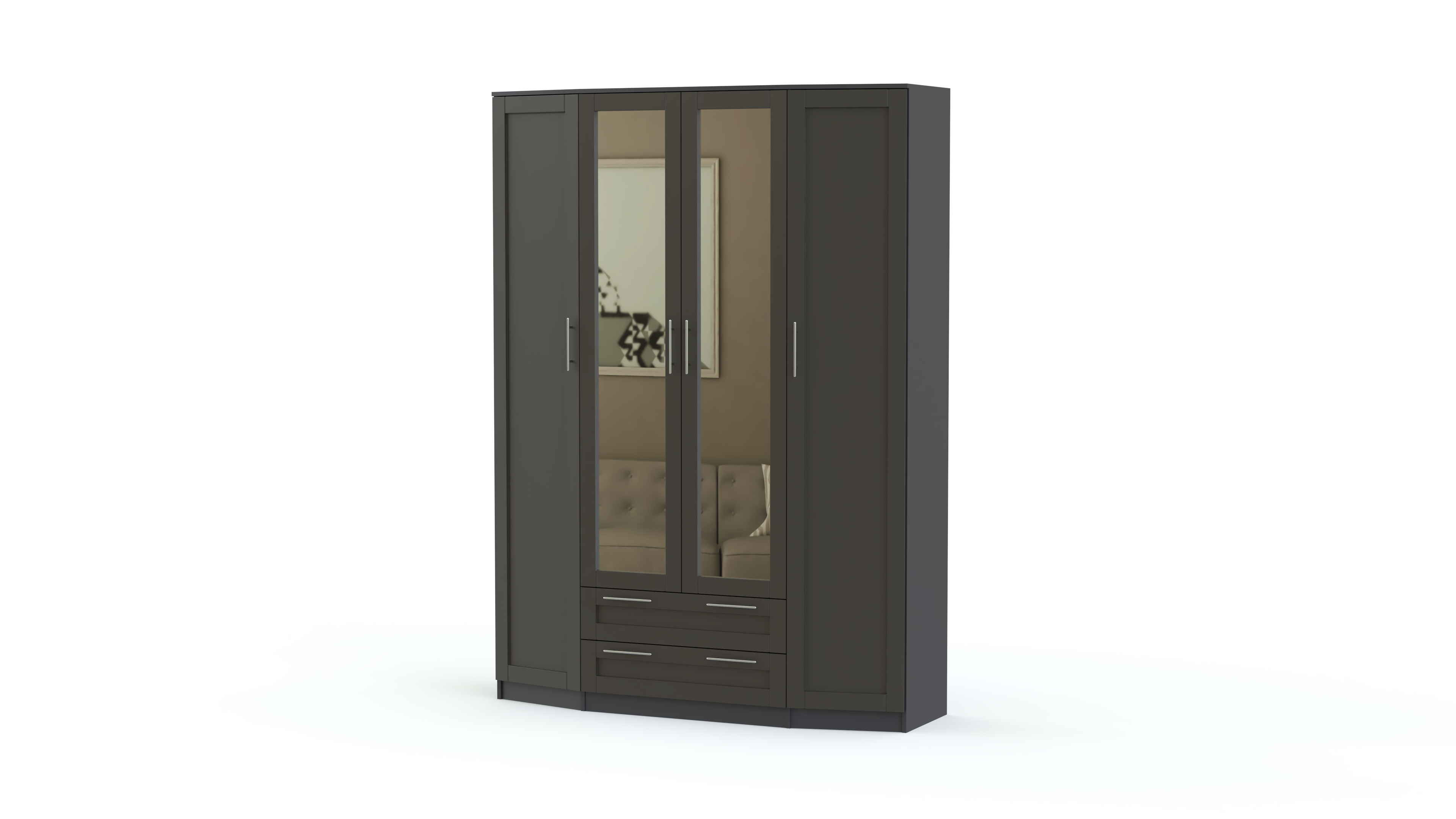 Стильная спальня Скандинавия BMS будет одинаково хорошо смотреться в современном помещении и комнате классического стиля. В ее оформлении удачно сочетаются простые формы, функциональность и интересный декор фасадов естественных древесных оттенков. В комплект входит состоящий из центрального с зеркалами и двух боковых скошенных элементов вместительный шкаф, удобный комод с навесным зеркалом, двуспальная кровать и две тумбы. Особенно выгодной покупка этого гарнитура будет в нашем интернет – магазине.