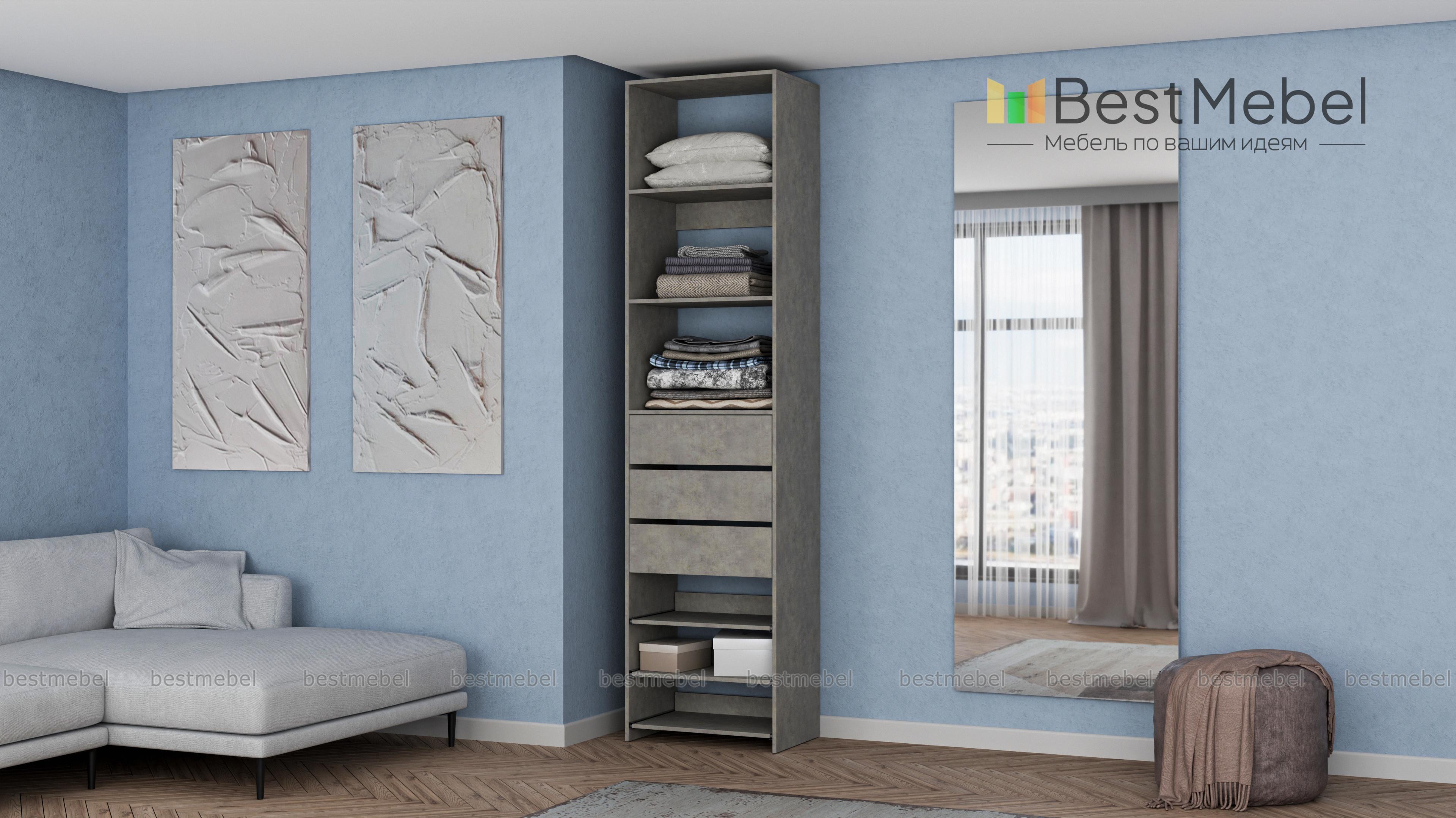 Стеллаж для одежды Мирта 77 BMS дополнит гардеробную систему или станет самостоятельным предметом меблировки. Односекционная модель оборудована тремя ящиками, стационарными и выдвигающимися полками для хранения одежды в сложенном виде, мелкого трикотажа, обуви и аксессуаров. Ламинированные поверхности влагостойкие и не требуют сложного ухода. Купить стеллаж для одежды Мирта 77 BMS, подобрав размеры и цвет под свой интерьер, можно на сайте нашего интернет-магазина.