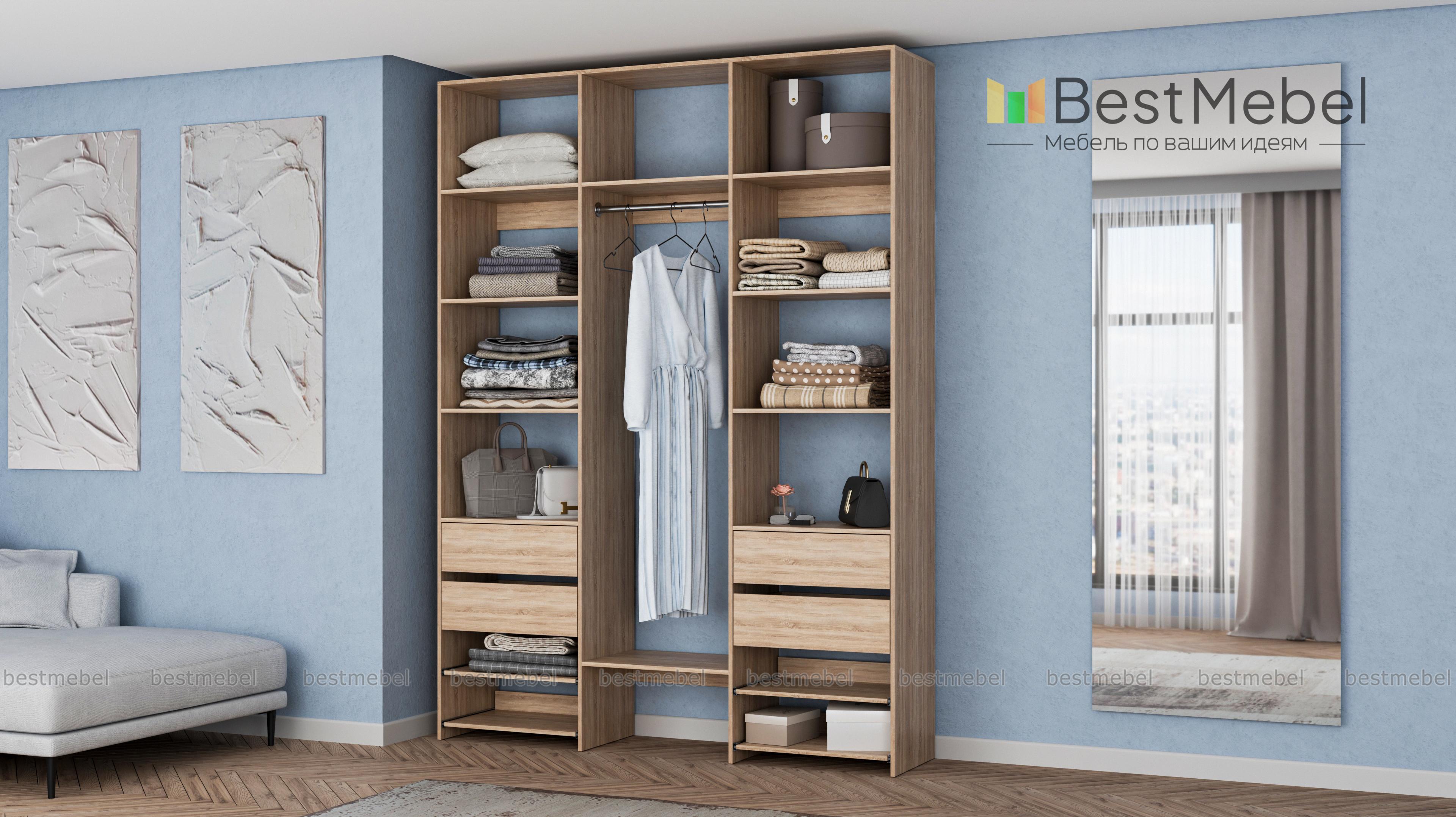 Стеллаж для одежды Мирта 94 BMS сделает удобным хранение различных предметов гардероба. Легко доставать вещи помогут вам открытые боковые и верхние секции, платяная штанга, две пары ящиков и выдвижные панели. Ламинированная плита в природном оттенке — экологичный современный материал, выдерживающий значительные нагрузки. Купить стеллаж для одежды Мирта 94 BMS вы сможете в нашем интернет-магазине, подобрав размеры и гармонирующий с вашим интерьером оттенок.