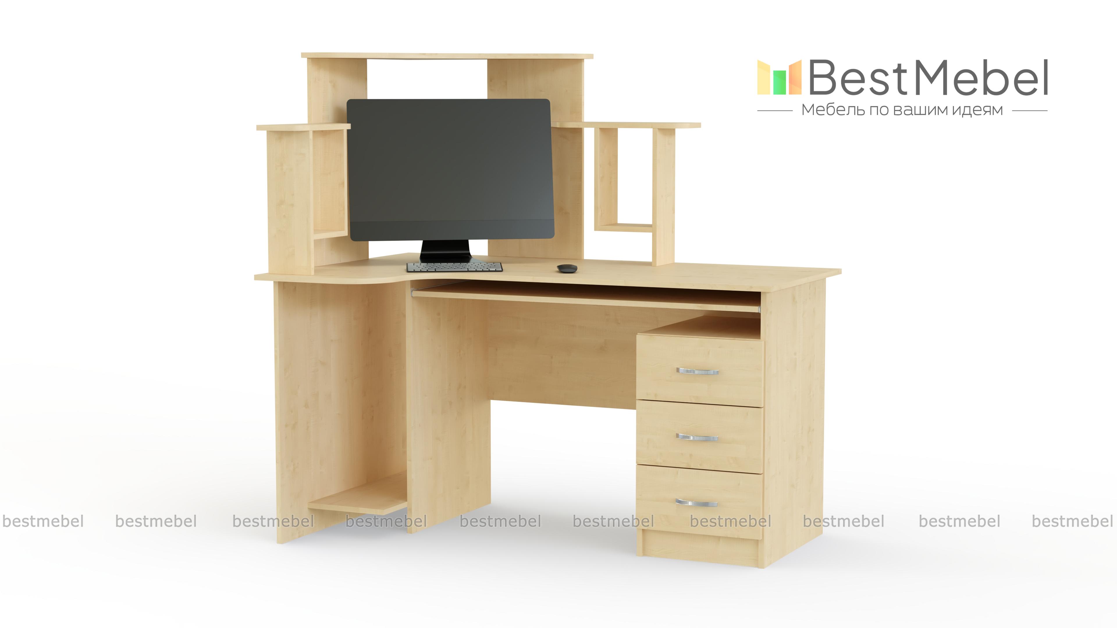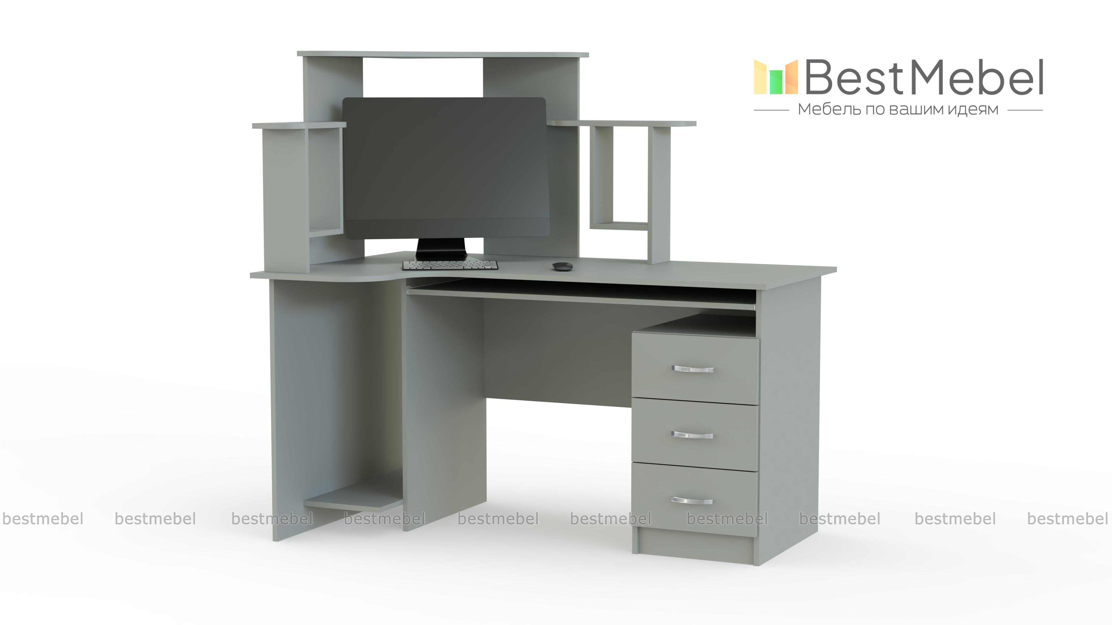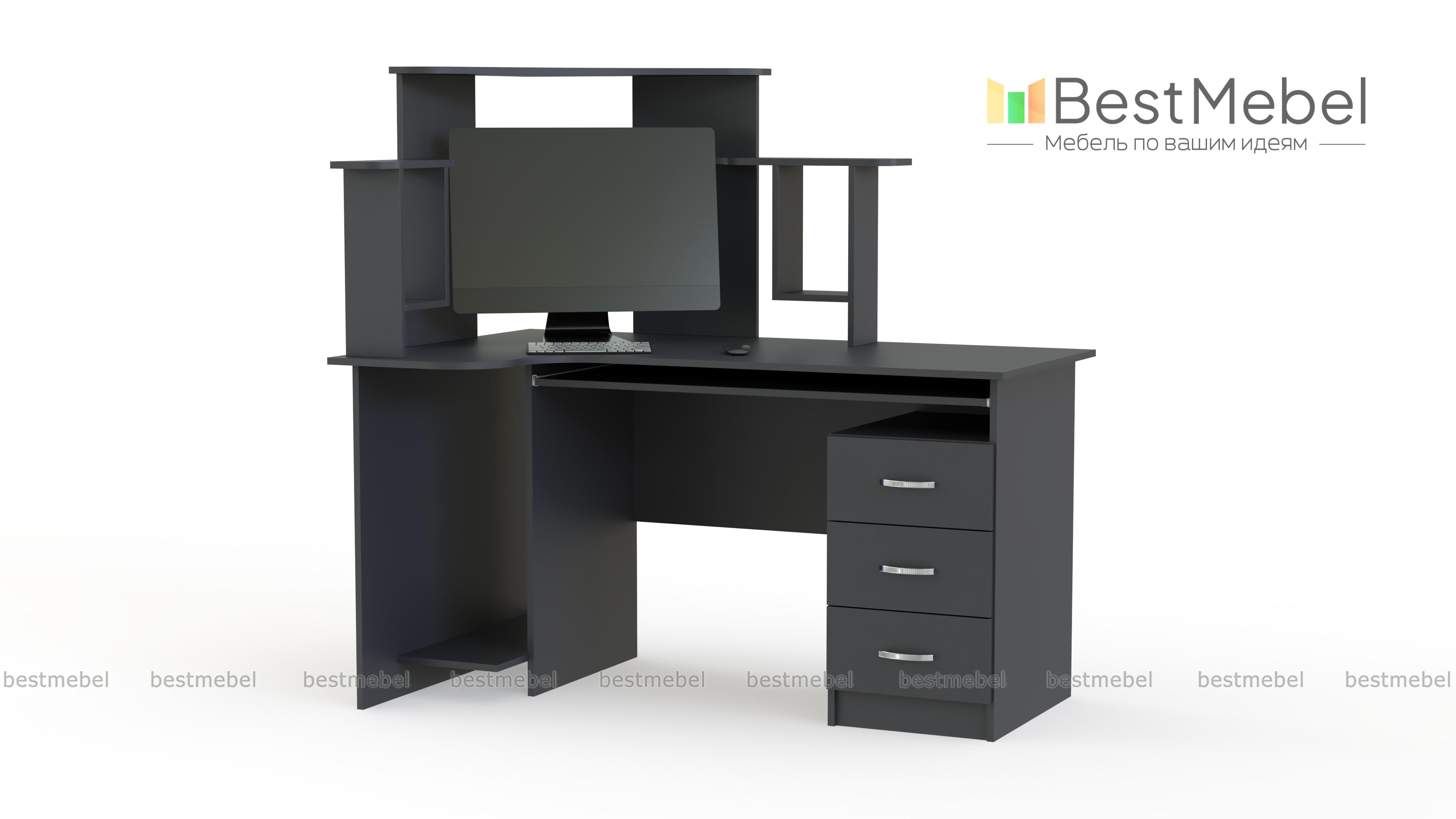 Интересная и оригинальная модель с неординарным расположением полок, которые не только служат украшением, но и предназначаются для удобного расположения монитора и дисков. Стол компьютерный СК-003 имеет специальные места для всех составляющих компьютера, удобное место для клавиатуры. Кроме этого, есть три выдвижных ящика для документов или других бумаг. Купить такую модель можно для активного компьютерного пользователя или ученика. При заказе Вы можете изменить базовые размеры и цвет.