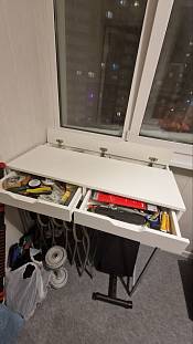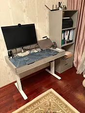 Отличный стол, копия икеевского стола Алекс. Только есть возможность изменить размеры, отделку, цвет, направляющие. Заказала одновременно со стандартным стеллажом. Собрали сами без проблем. Прикрутили к подстолью с подъемным механизмом. Получился очень комфортный мини-офис на дому.