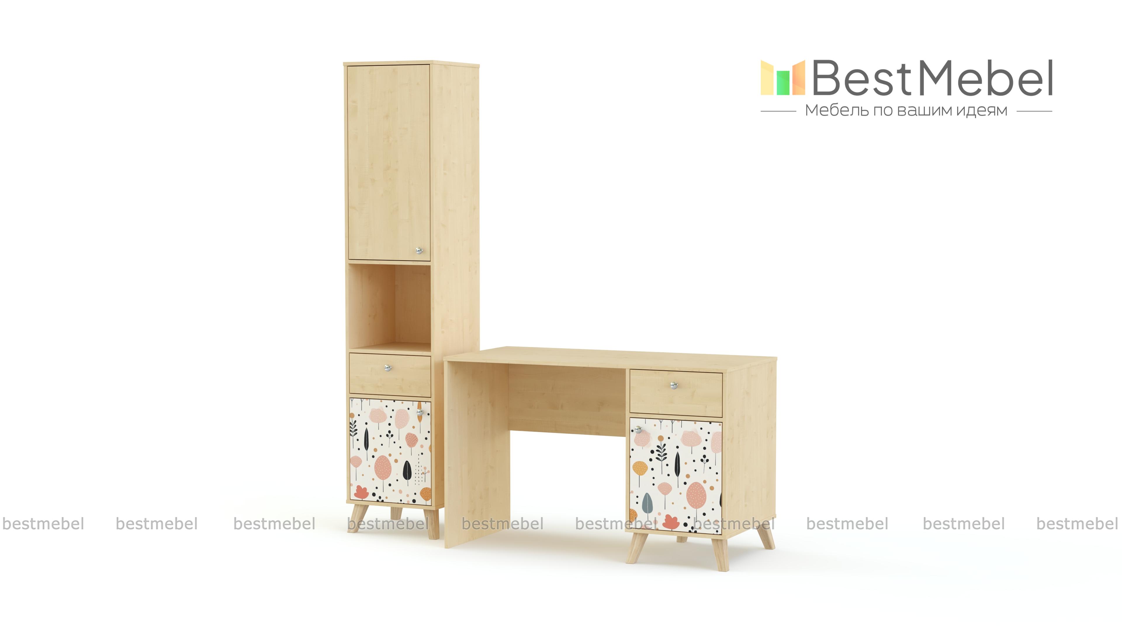 Стол письменный Эльза 6 BMS дополнен удобной системой хранения для учебников, тетрадей, материалов для творчества. Классический прямоугольный стол оборудован тумбой, а рядом располагается комбинированный с ящиком и закрытыми полками стеллаж. Композиция для детской выполнена из прочной ламинированной ДСП в комфортной для глаз цветовой гамме, нижние фасады декорированы симпатичным принтом. Купить стол письменный Эльза 6 BMS вы сможете в нашем интернет-магазине, подобрав цвета и размеры.