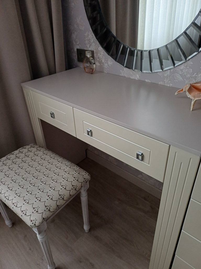 Приобрела столик вместе с комодом. Дл я меня важным было сделать в динаковом цвете и в нужном мне размере. Все получилось. Хотя в нашем городе нет представительства фабрики пришлось заказывать цвет на страх и риск. Но все сложилось замечательно. Рекомендую !!!!