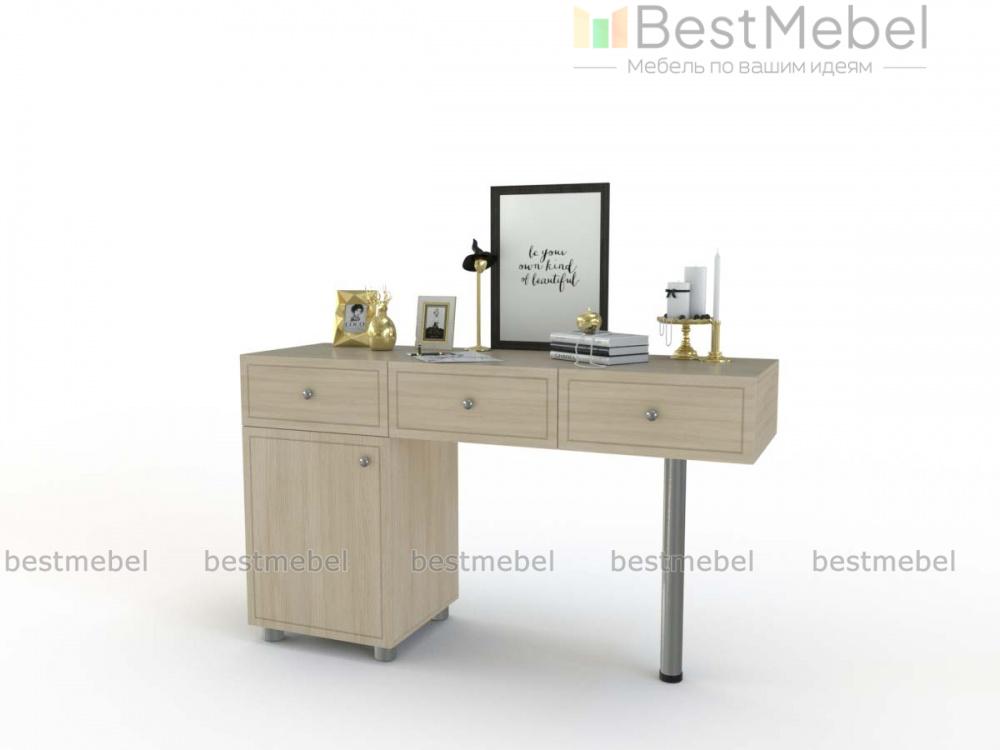 Туалетный столик Ноче СТ-11 BMS представляет собой элегантную консоль с тремя выдвижными ящиками, которую поддерживают распашная тумба и регулируемая хромированная опора. Удобная система хранения и просторная столешница позволят разместить под рукой все необходимые мелочи и сделать уход за собой комфортным. Фасады в светлых тонах декорированы фрезерованными линиями и дополнены ручками-кнопками. Купить туалетный столик Ноче СТ-11 BMS для современной спальни приглашаем в наш интернет-магазин.