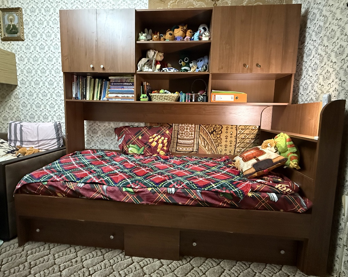 Кровать идеальна для маленькой комнаты!!! Все вещи в полках, книжки, игрушки - все влезло!  К сожалению, попали в какой-то предновогодний ажиотаж и ждали изготовления почти 2 месяца. Собирал сам муж, у него есть вопросы к инструкции по сборке: не соответствуют детали номерам. И хрупкая очень , чуть ударил - тут же скол(((